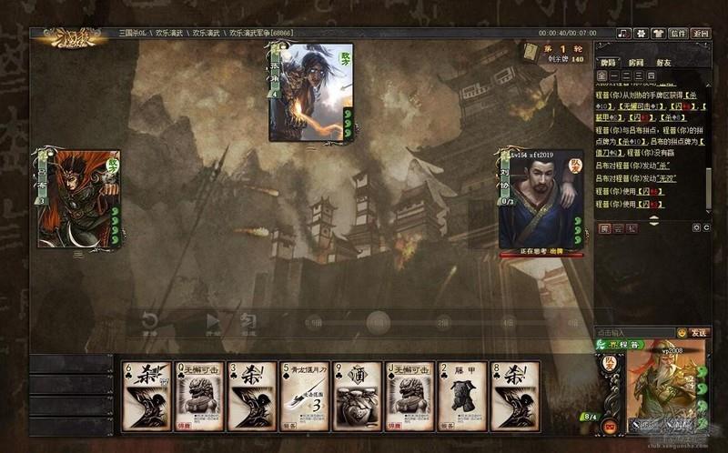 本局程普位于四号位,一号位队友为刘协,可为其补杀。开局时给程普牌拼点,使用杀进行拼点,发现用于拼点的杀无法触发技能效果。
