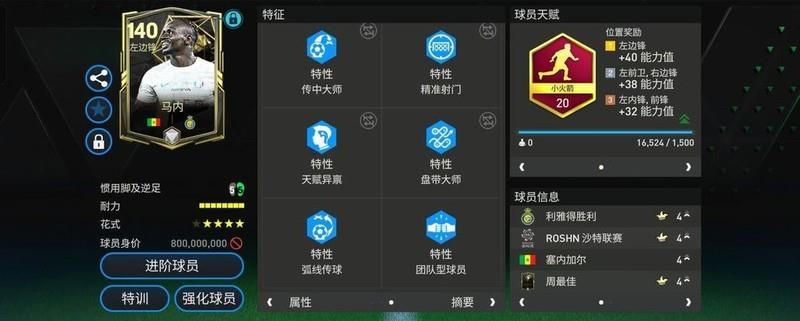 马内具备铁人、反越位大师、传中大师、精准射门、天赋异禀、盘带大师、弧线传球以及团队型球员等多项特性。反越位大师特性增强了他前插的主动性,传中大师与弧线传球则进一步提升了他原本就出色的传球能力,使传球更精准且弧线更理想。精准射门特性的加持,也让他的射门更加稳定可靠。