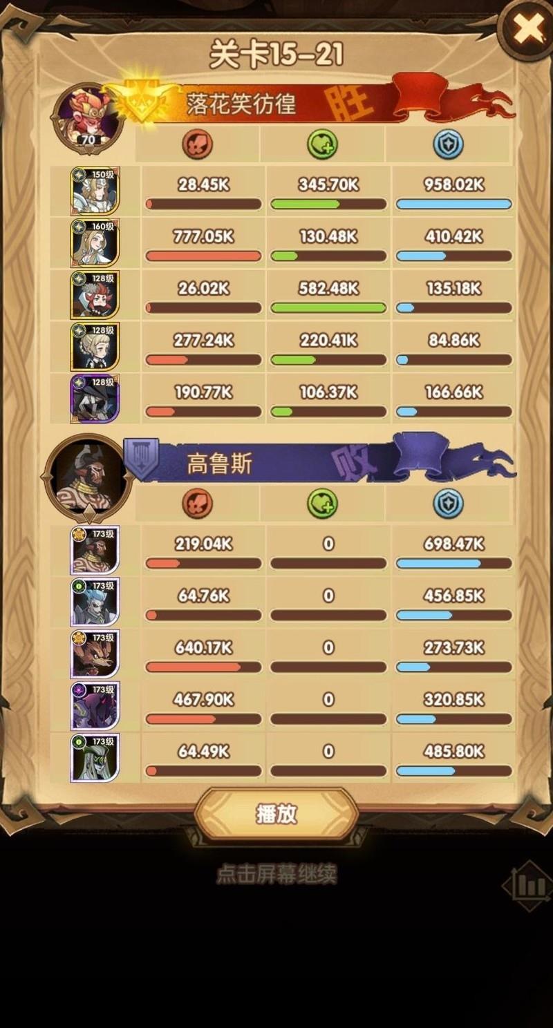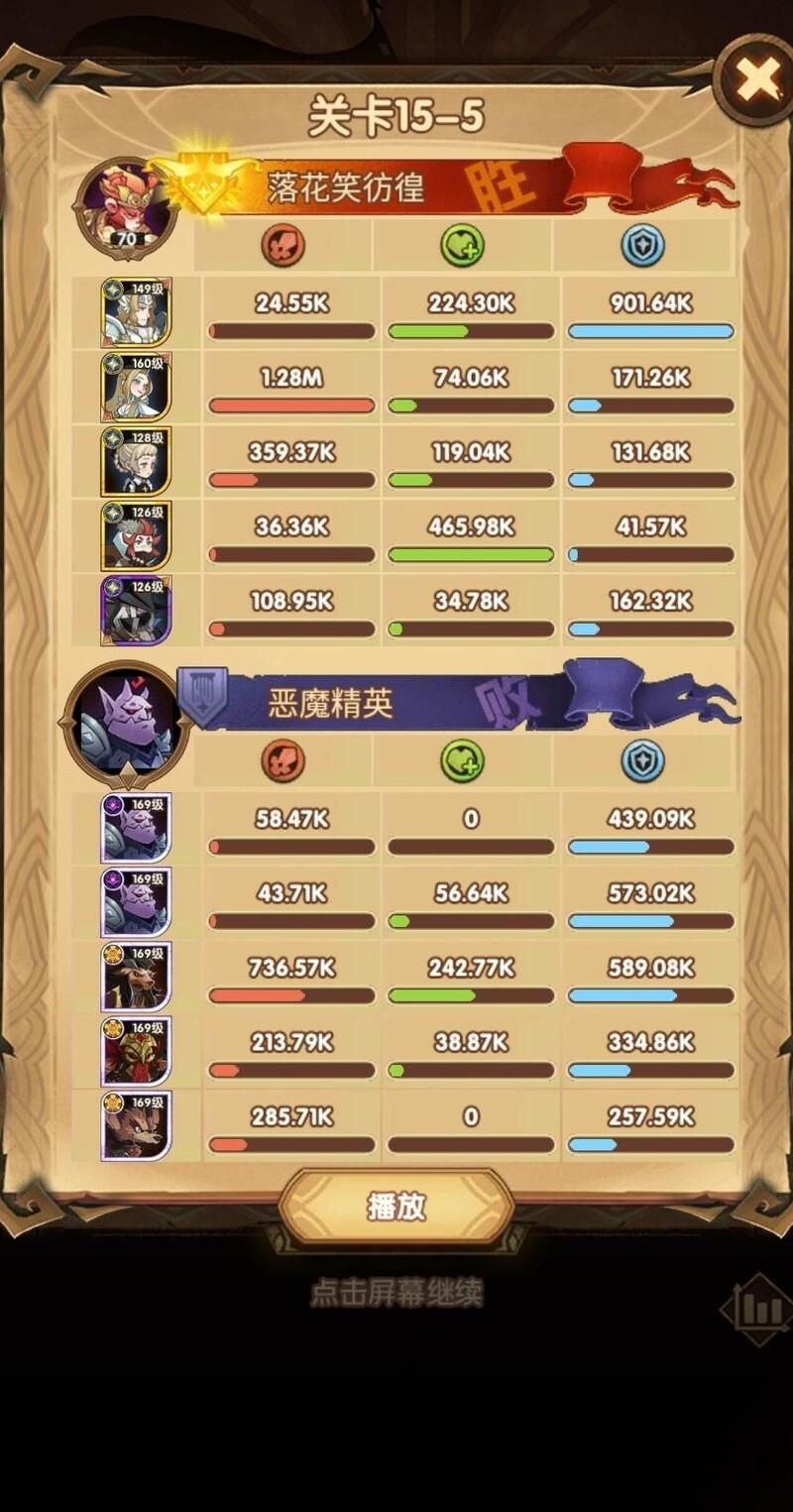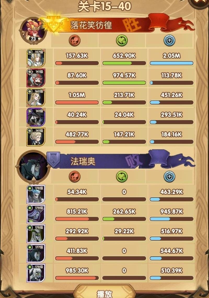这关阵容为15-40,可能是15章最难的一战,卡了很久才通过。相比女妖,光女通关难度更高。我的配置是:光女配备红色武器和红鞋,使用神圣之刃;女仆带红武,商人装备红武红鞋并携带胜利号角;光盾则搭配红鞋与红帽,佩戴复苏之佑;神器选择神王之眼。关键在于利用光女与女仆的配合,在禁卫释放大招前迅速将其击杀,同时光盾必须稳住防线扛伤。幸运的是,我的光盾两件红装均为光耀属性,提升了生存能力。随后光女与女仆联手释放双大招,精准秒杀即将开大的女妖。只要商人和光盾存活,基本就能顺利过关。