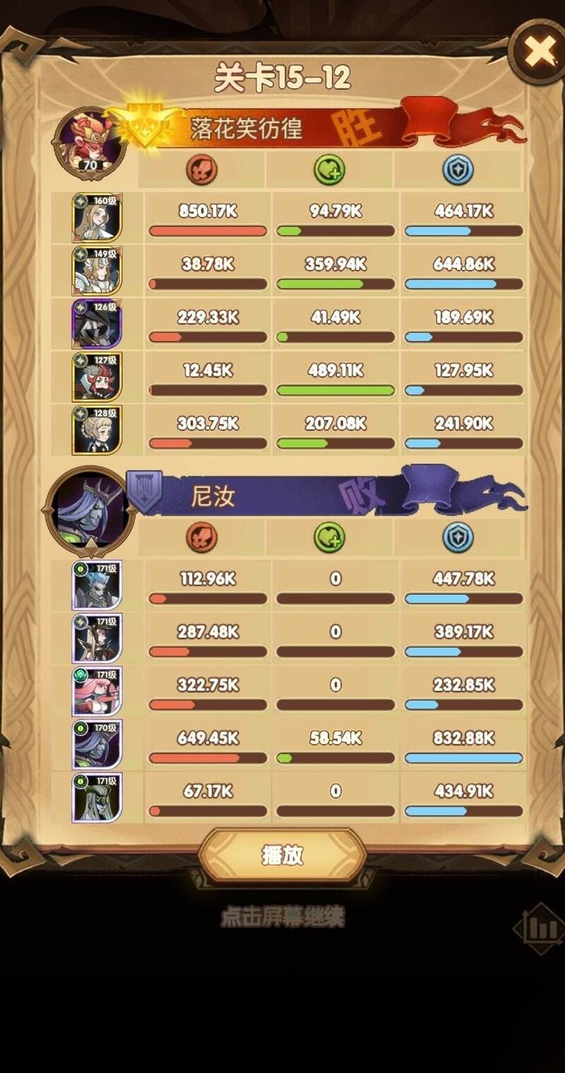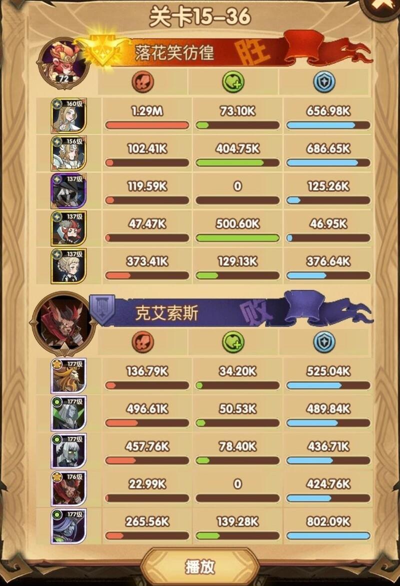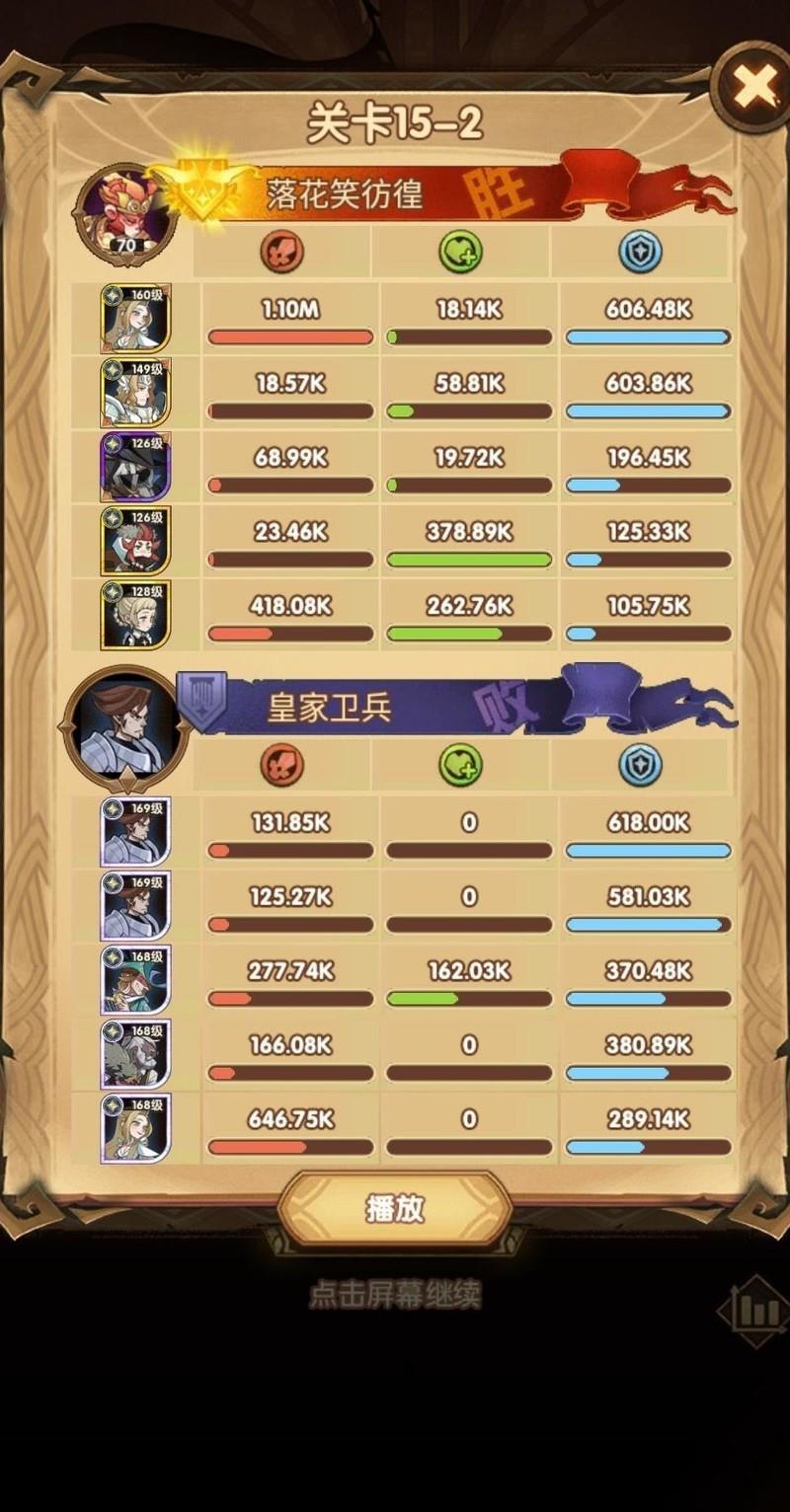 这关阵容为15-40,可能是15章最难的一战,卡了很久才通过。相比女妖,光女通关难度更高。我的配置是:光女配备红色武器和红鞋,使用神圣之刃;女仆带红武,商人装备红武红鞋并携带胜利号角;光盾则搭配红鞋与红帽,佩戴复苏之佑;神器选择神王之眼。关键在于利用光女与女仆的配合,在禁卫释放大招前迅速将其击杀,同时光盾必须稳住防线扛伤。幸运的是,我的光盾两件红装均为光耀属性,提升了生存能力。随后光女与女仆联手释放双大招,精准秒杀即将开大的女妖。只要商人和光盾存活,基本就能顺利过关。