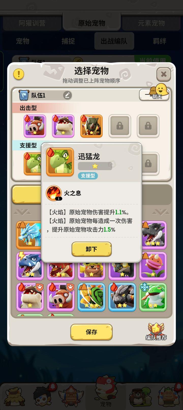 原始宠物搭配推荐:出击位可选火龙或暴君龙,支援位推荐火龙或迅猛龙。
