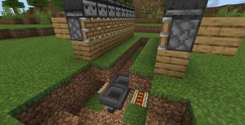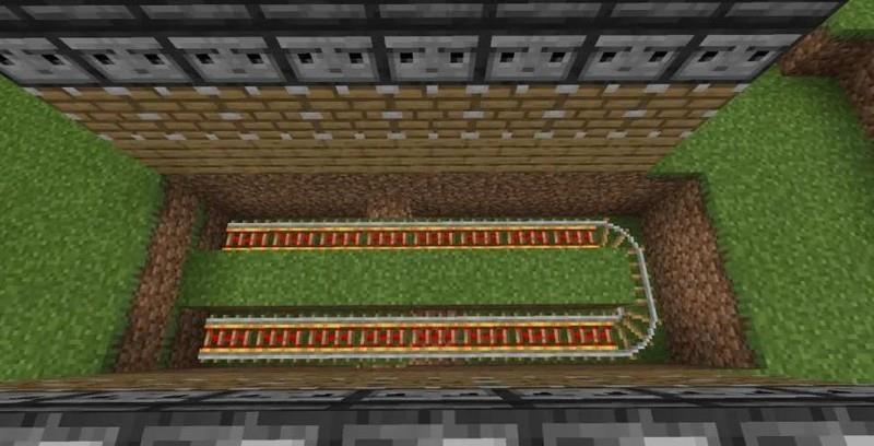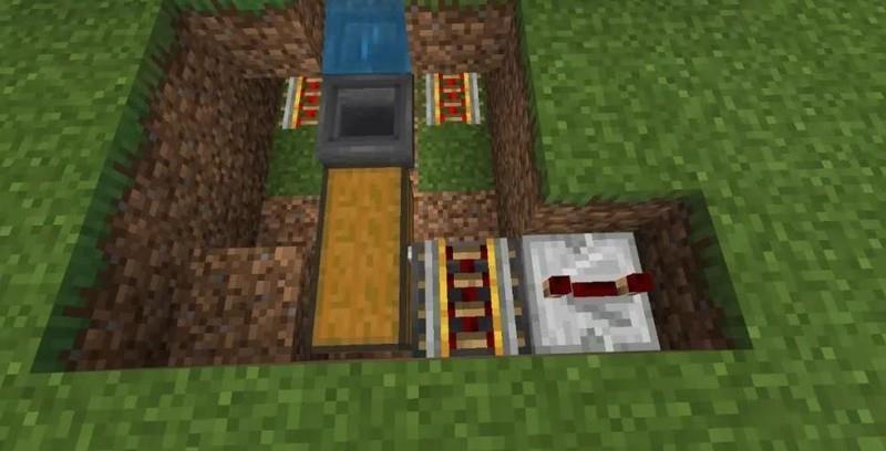 将泥土覆盖铁轨,在中央坑道末端放置两个按图示方向的漏斗。