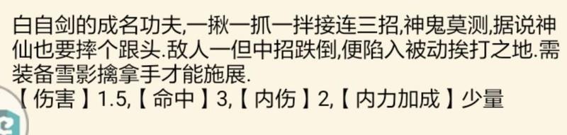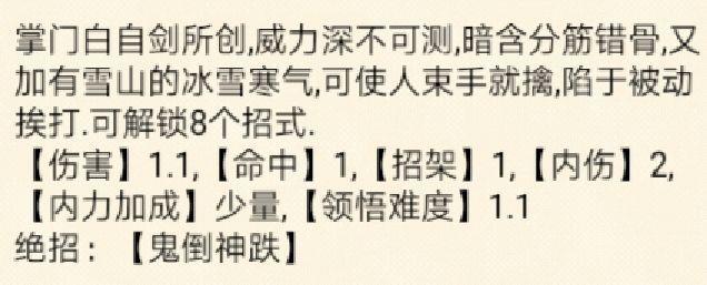 「雪影擒拿手」:伤害略高,命中与招架均衡,内伤效果显著,附带少量内力加成,领悟难度适中。