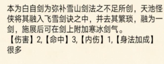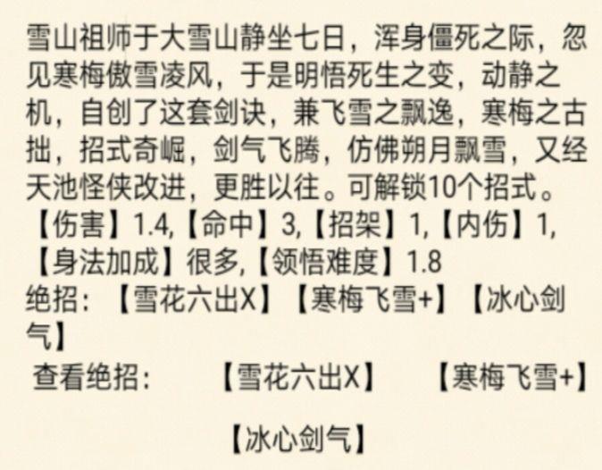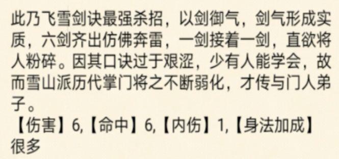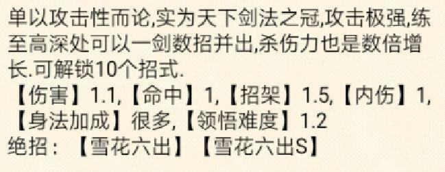 「飞雪剑诀」:伤害1.4,命中3,招架1,内伤1,身法加成极高,领悟难度1.8,属高阶剑法,飘逸灵动,攻守兼备。