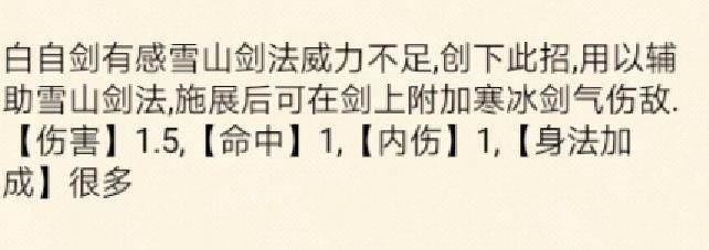 雪山剑法:伤害略高,命中正常,招架出色,内伤效果一般,身法加成显著,领悟稍难。