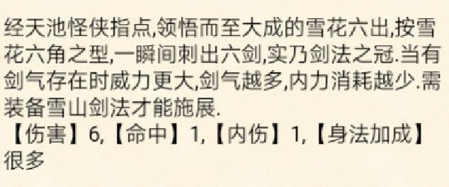 绝招:雪花六出,造成6点伤害与6点命中,附带1级内伤,大幅增加身法效果。