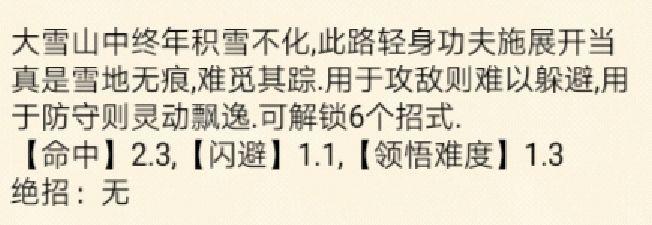 踏雪无痕,命中2.3,闪避1.1,领悟难度1.3,轻功绝学,行踪难觅。