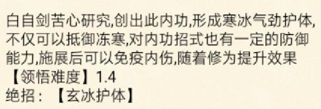 绝招:玄冰护体,可使自身在接下来五回合内,将所受伤害的50%以内力按1:2比例抵消(1点内力抵2点伤害),内力消耗比例恒定,不随等级变化。