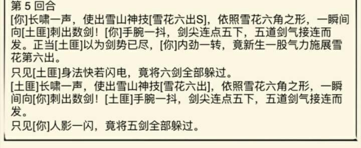 雪花六出:伤害5,命中1,内伤1,大幅增加身法属性,威力强劲。