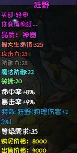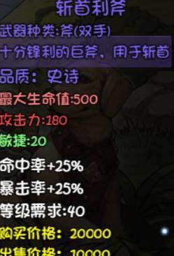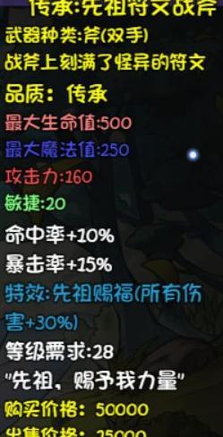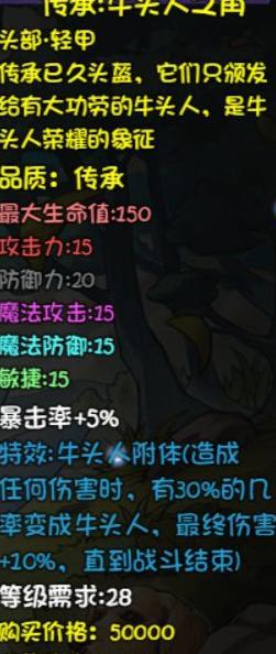 攻击时有一定几率变身为牛头人,获得10点最终伤害加成,自带5点暴击属性。适用于多段输出角色,强度尚可,但优先级低于海盗帽。建议先获取掉率装备或符文战斧,后者为强力斧类武器,具备高额属性加成,暴击与物理伤害提升显著。