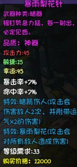 粉色暗器,普攻转为范围伤害,堪称暗器中的珍品,极大增强了教主实力。