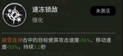 强化普攻后,普攻将变为爆炸效果,可降低敌人移速,略微压制前排。若拥有紫色神器,可延长减速时间并扩大爆炸范围。但若前排不够强势,无法为敌方堆积大量单位,则该强化效果将难以发挥。