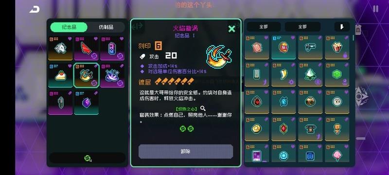 在上一层中,恶魔翅膀已被献祭,因此这一层需使用二号飞行道具天马。第三、四层推荐使用火焰二系流派。由于上一层购买的黑客工具可继续搭配钢笔使用,再配合火焰漩涡、彩色手柄清理敌人,同时用蛋糕提升范围攻击,力量之石则弥补近战输出,整体仍可实现快速通关。过程中尽量拾取两个刀二,最好能获得暴怒或美瞳,前者提升后续伤害,后者节省格子空间。蛋糕与力量之石可用于后续献祭。
