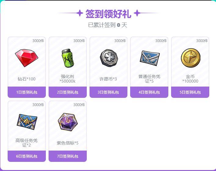 登录网络签到即可领取钻石*100、强化剂*50k、高级信标*5等丰厚奖励,更多惊喜等你来拿,先到先得!
