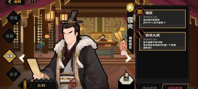 霍光的技能效果强大,但前提是敌方庙宇数量少于25,条件苛刻,难以触发。因此建议拥有吕雉的玩家优先选择吕雉,避免选用霍光。尽管如此,霍光的技能仍具优势,可在进入营地后立即获得首个政策,并且无需消耗粮草,具备一定战略价值。