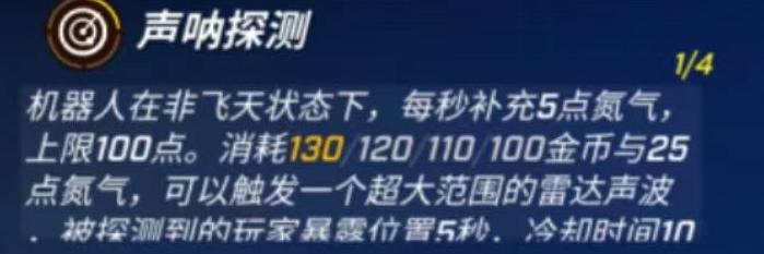 主动天赋-声呐探测:机器人在地面时每秒恢复5点氮气,最多储存100点。花费130/120/110/100金币并消耗25点氮气,可释放超大范围雷达声波,使范围内敌人位置暴露5秒,冷却时间为10秒。