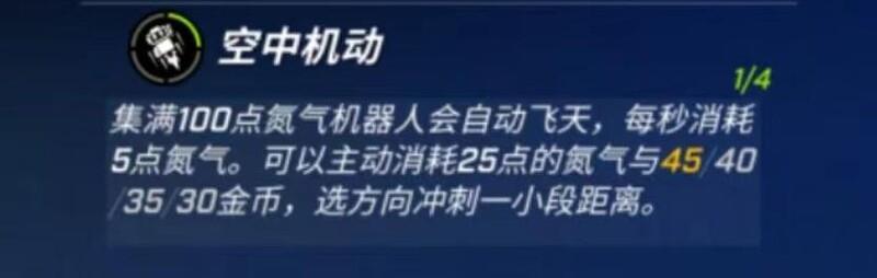 被动天赋-空中机动:机器人积累满100点氮气后将自动升空,每秒消耗5点氮气维持飞行。可主动花费25点氮气及45/40/35/30金币,朝指定方向短距离冲刺。