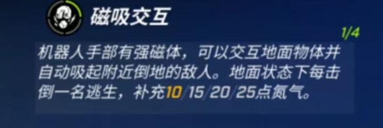 被动天赋-磁吸交互:机器人双手内置强力磁铁,可与地面物品互动,并自动吸附周围倒地的敌人。每次在地面击倒逃生者,将为其恢复10/15/20/25点氮气。