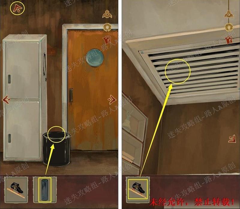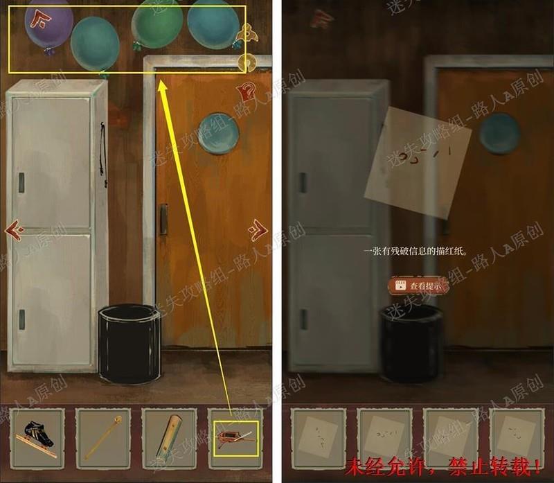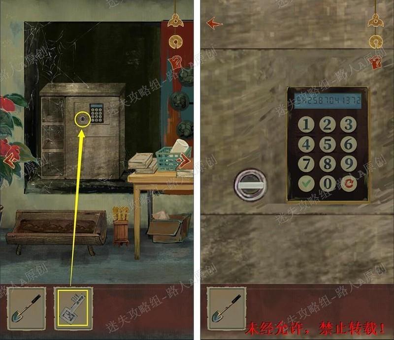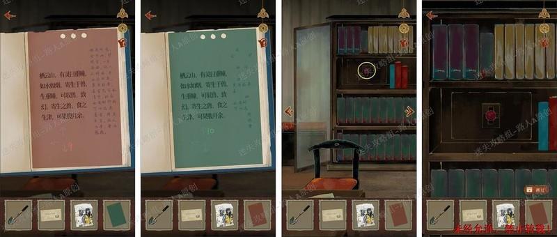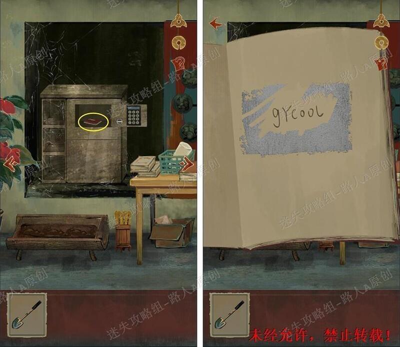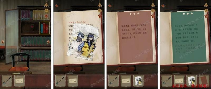 对带有箭头图案的书页依次使用红色与绿色暗记板,可获得密码上上下下左左上右下上,输入后开启保险箱,取得其中的残破照片。