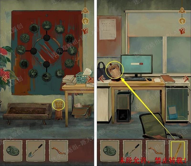 拾取铁锹与生肖龙石刻,用铁锹挖掘花盆,获得蚯蚓。