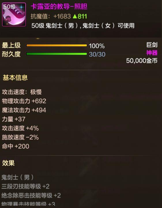 卡露亚的教导—照胆是50级粉色巨剑,因基础物理攻击高,在游戏初期作为过渡武器广受玩家欢迎。