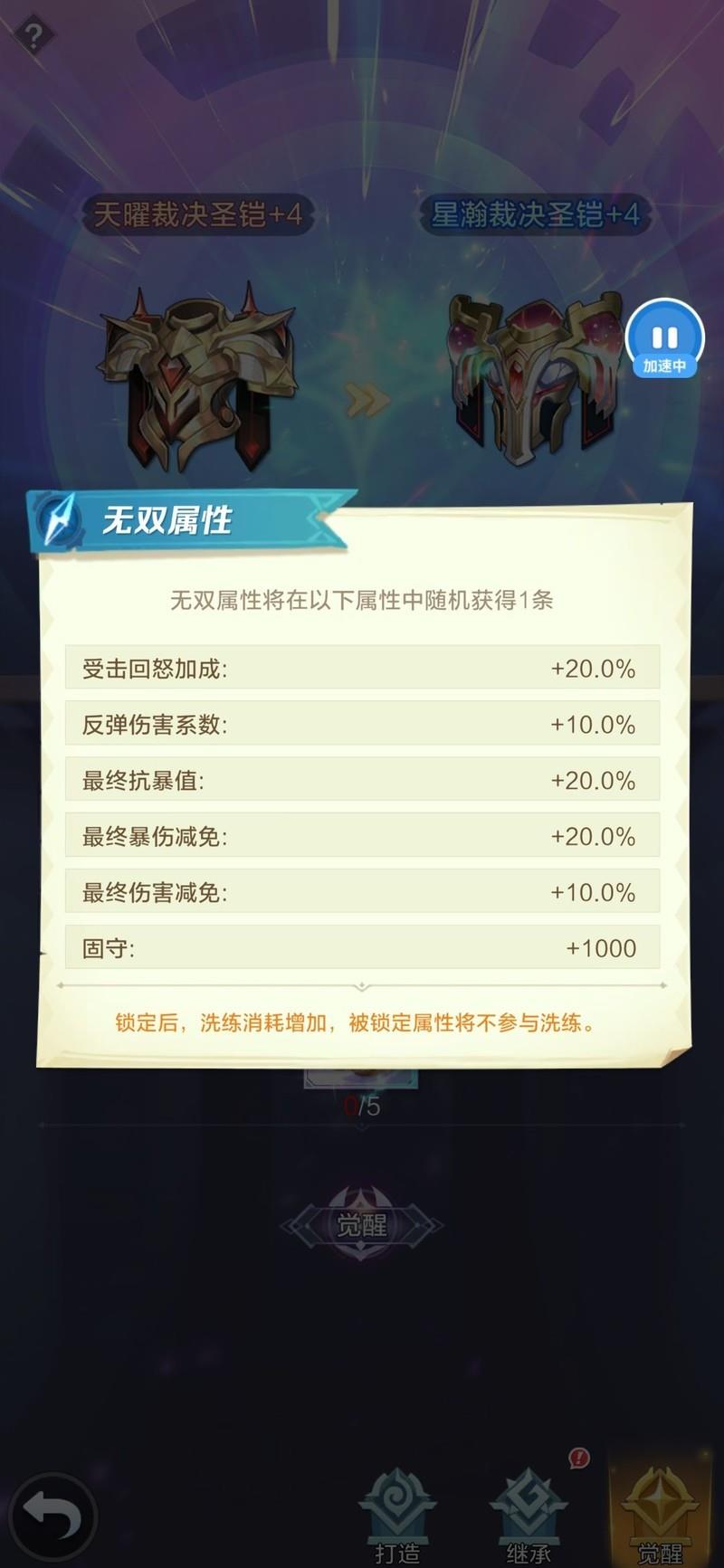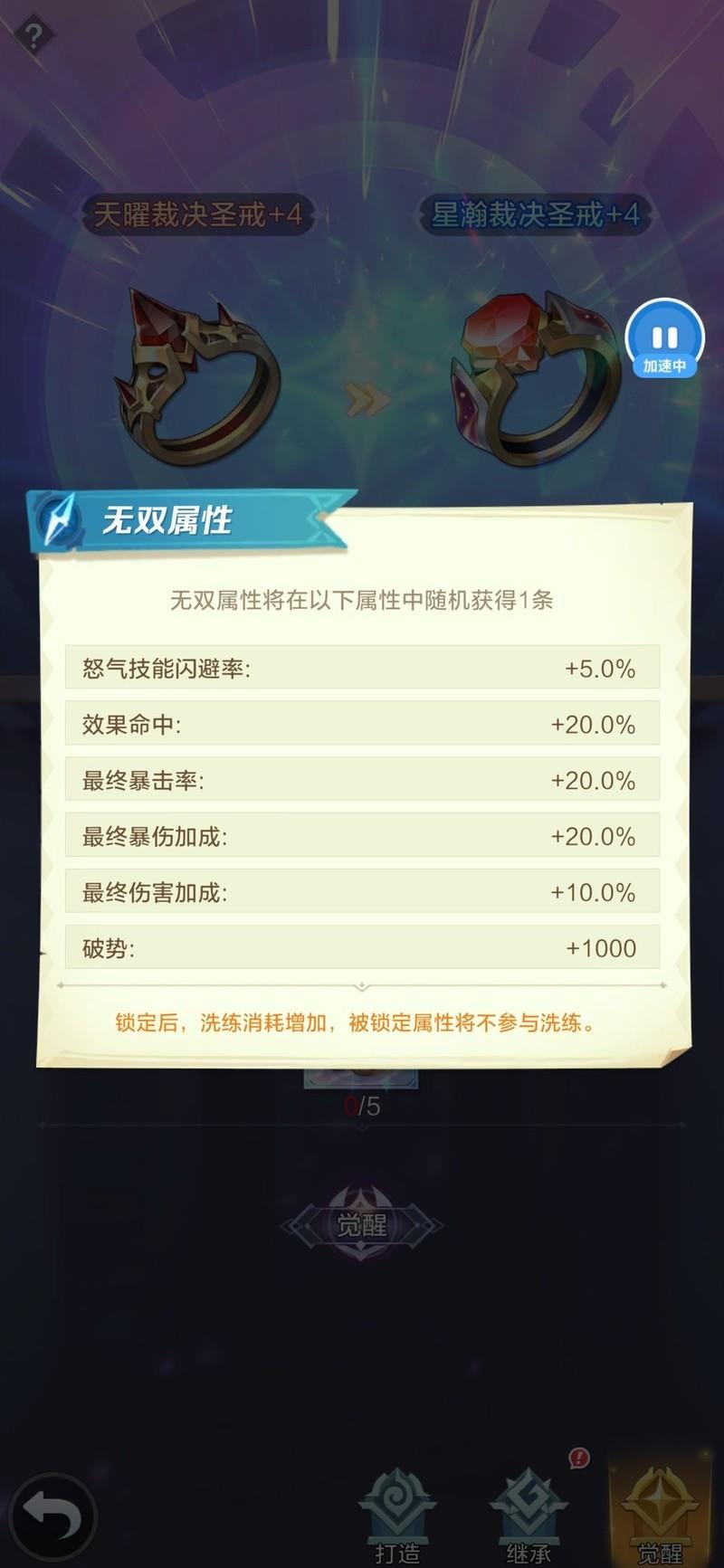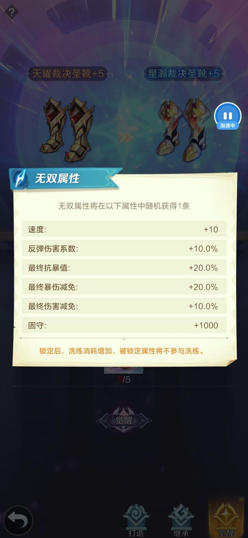 由于星瀚鞋的无双词条可能随机出10点速度,我们建议优先觉醒鞋子,先尝试这次机会。后续若遇到合适时机且资源充足,可再考虑刷取。但更推荐先凑齐星瀚三件套后再进行补充。