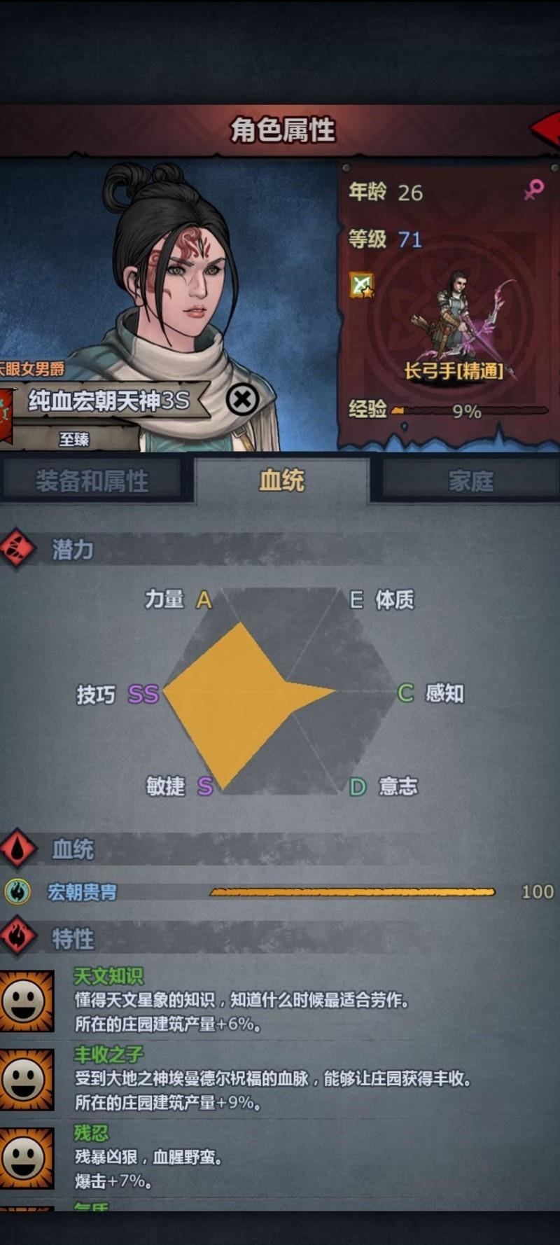 宏朝已成型,寿命优于佩尔(虽不及吉人),属性各有长短。因技术提升,欲尝试屠弓玩法,遂打造了神器级弓箭。