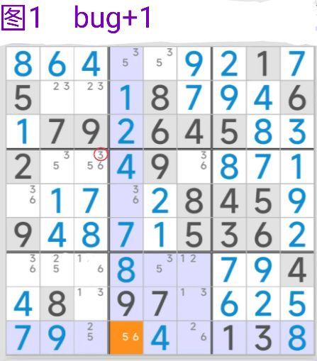 ur结构是在两宫、两行或两列中形成稳定状态的关键结构,而bug 1则涉及整个数独盘面的所有候选数。bug 1的构成特点是:整个盘面中仅存在一个三候选数的单元格,其余所有单元格均为双候选数格。同时,该三候选数格中的某个数字a,在其所在的行、列及宫内均恰好出现三次。满足这一条件的结构即为bug 1。若存在两个三候选数格,并且每个格中各有一个数字(如a和b),这两个数字在其各自所在的行、列、宫中也都分别出现三次,则构成bug 2结构。在bug类结构中,超出常规的候选数被称为真数。