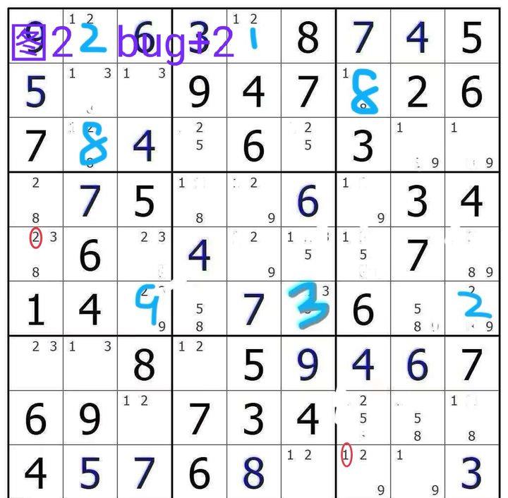 通过逻辑分析可以得出,bug结构中的所有真数不可能同时为假,这一结论已被大量实例所验证。bug的表现形式多样,例如在图1和图2中,bug的真数分布在不同的单元格中,也有例子显示真数出现在同一个格子中。因此,bug并不局限于三值格的结构,它还可以以多种形式存在,只不过三值格更容易被识别。不变的是,当某个局面中某些数字同时为假时,整个局面将只剩下双值格,且所有数字在其所在的行、列或宫中均形成共轭对,这种结构即为bug的标准形态。