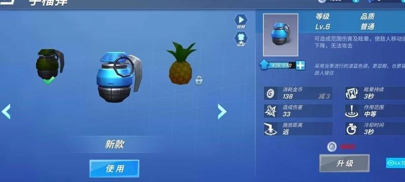 手榴弹是一种基础而实用的投掷道具,使用后可对指定位置造成33点伤害,并使范围内敌人眩晕3秒,期间降低其移速并禁止攻击。该技能冷却时间为3秒,初始消耗150金币,随装备升级费用递减。操作简单直接,适用于快速控场与输出,是战斗中高效的辅助利器。