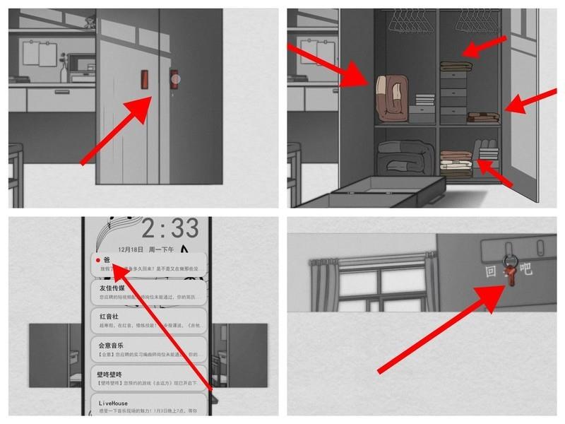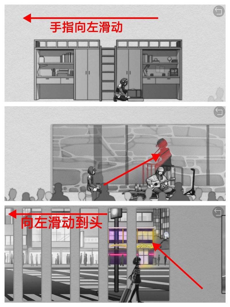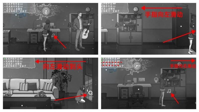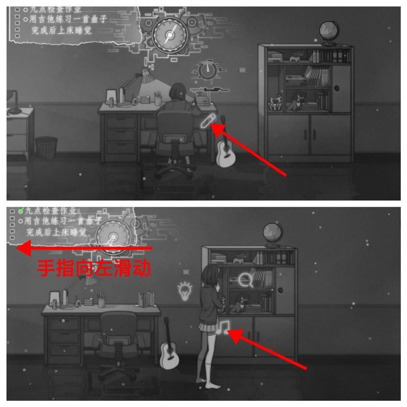 第三天晚上开始时,女主的父亲会把吉他收起来,因此我们需要先拿到才能继续演奏。照例先完成作业,进行QTE校准。完成后向左滑动屏幕,离开卧室。继续向左滑到底,点击壁橱进行探索,这里会触发一次QTE校准,成功后即可获得。接着向右滑动屏幕回到书架前,点击音符开始演奏。演奏流程可参考第4点中视频后半段的操作。