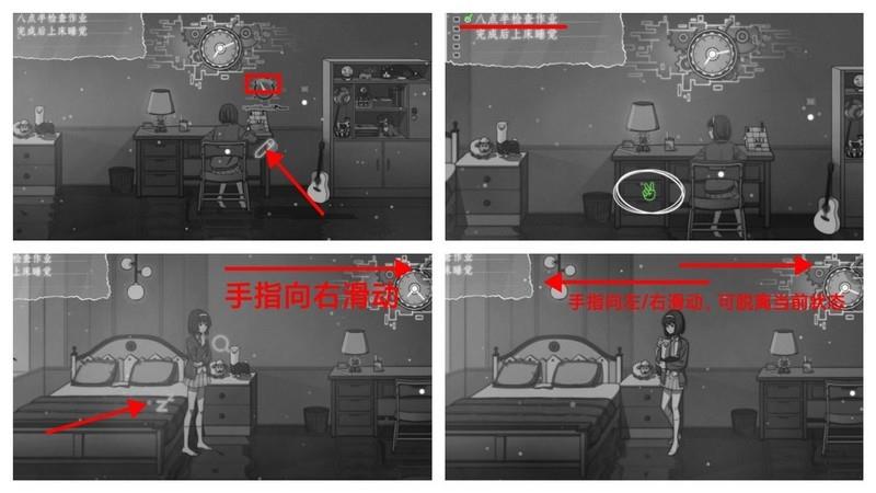 第一个夜晚,当你开始写作业时会触发一个快速反应事件。需要在指针进入白色区域时迅速点击铅笔图标,只有当指针最终停在白色区域才算成功,进度条填满后即可完成第一项任务。随后向右滑动屏幕走到床边,点击床铺即可上床休息,结束第一天。若在某些操作中无法退出,例如拿起玩偶却找不到放下选项,可以尝试左右滑动屏幕来脱离当前状态。