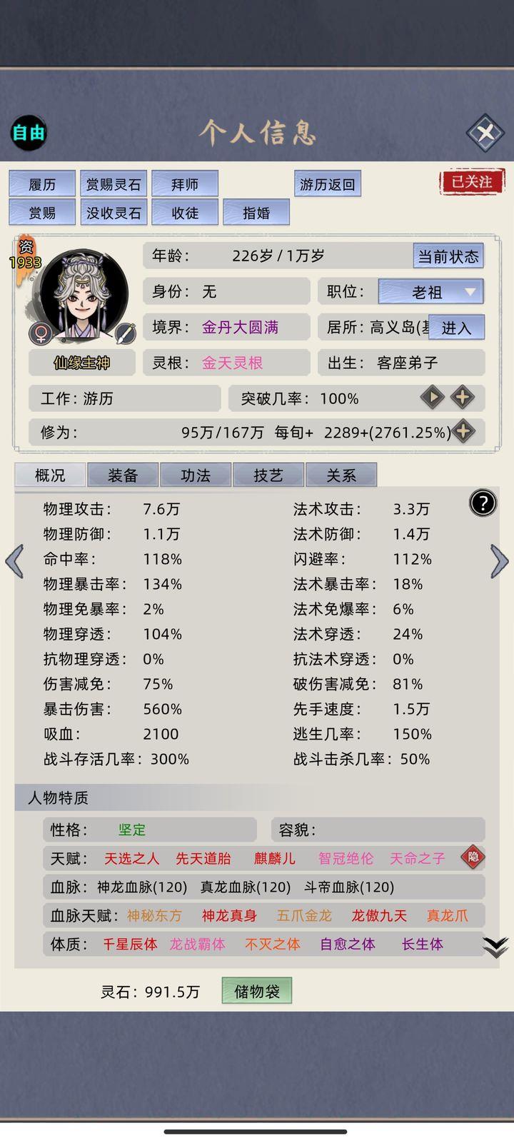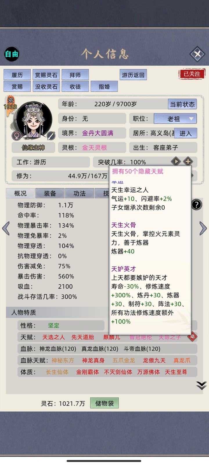 开局选择自由模式,老祖无特殊要求,不带任何天赋(为后续完美天赋做铺垫),血脉设定为零,五灵根起步。保留天赋点,确保获取游戏中唯一且不可重复获得的关键道具,重点是能获得太上长老身份。