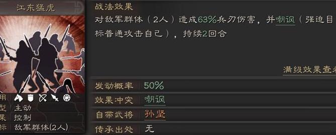 孙坚的自带战法可对两名敌军造成63%的兵刃伤害,同时施加持续两回合的嘲讽效果。该战法发动概率为50%,但只要成功释放,嘲讽必定生效,不受概率影响。因此,主属性优先提升武力值,能更好地发挥其战法威力,使输出与控制效果更加稳定协调。