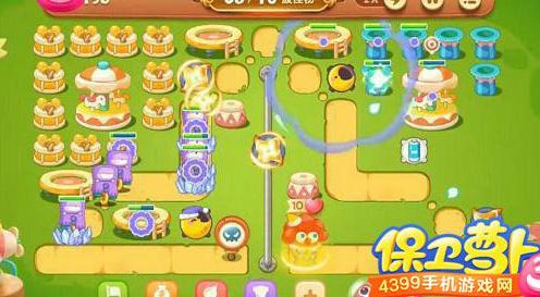 在怪物出口处放置月亮,右侧配忍者镖,逐步将三座炮塔升至满级。