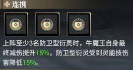 牛魔王的连携可提升所有防御型衍灵的灵技减伤效果,黄狮精则增强全体成员的最终减伤能力,而多闻天王提供的护盾进一步提升了队伍的生存能力,三人共同组成本阵容坚实的前排防线。