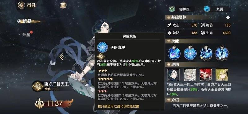 广目天王与多闻天王并肩作战,能够通过连携技能为多闻天王提供减伤效果,同时利用灵技驱散敌方增益,间接提升我方输出与生存能力。