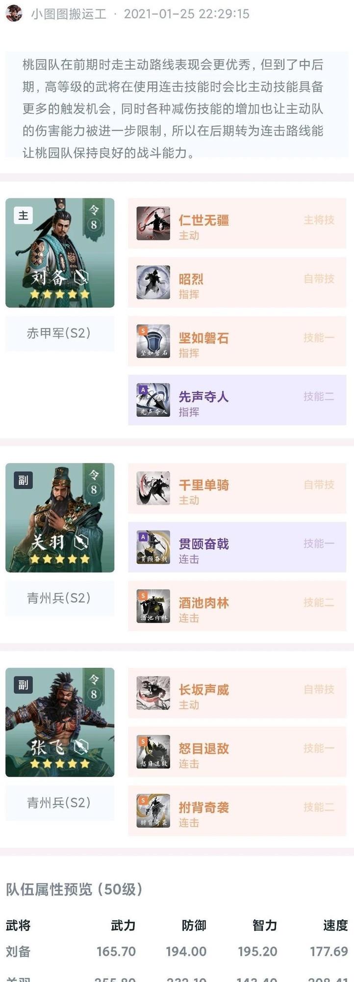 桃园队是S1赛季首次亮相的阵容,以主动技能为主打,配合得当,表现全面,进入S2赛季后,虽然实力没有明显减弱,但整体表现变得更平稳,成绩也只是中等水平。