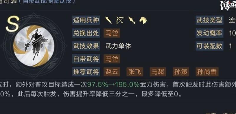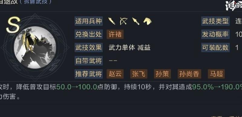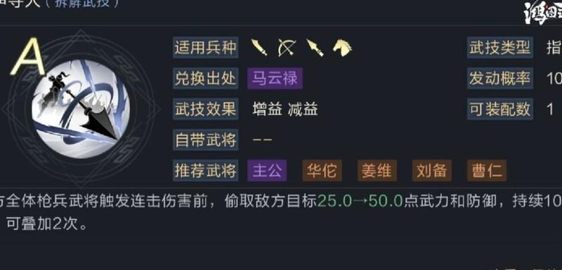 推荐使用怒目退敌作为1号武技,可使目标防御降低100点,并造成190%武力伤害。配合先声夺人能显著提升实际输出,同时大幅增强其他技能的伤害效果,整体作战能力显著提高。