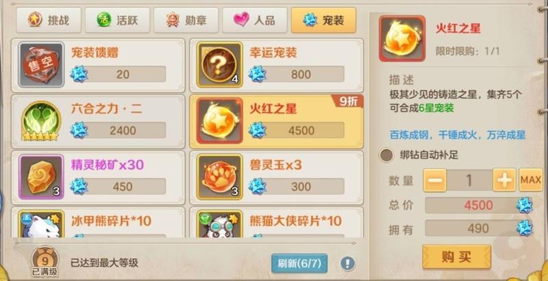 宠物装备打造积分初期仅能兑换五星以下装备,建议暂不兑换,待开放火红兑换时再使用。
