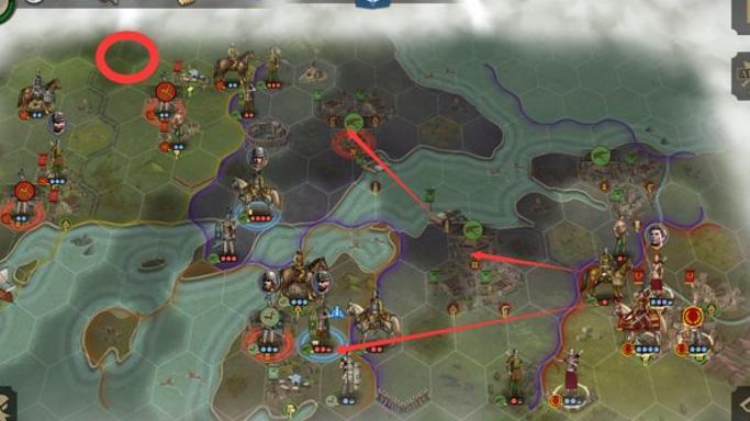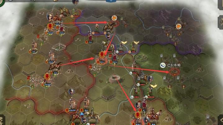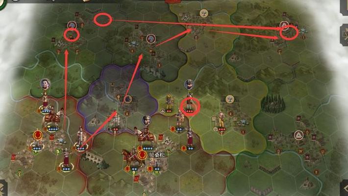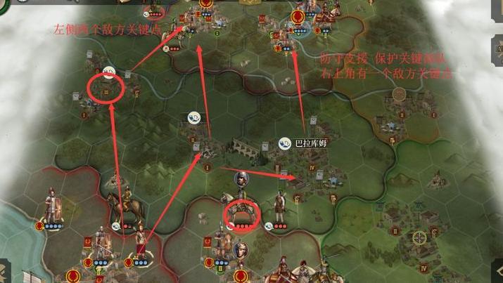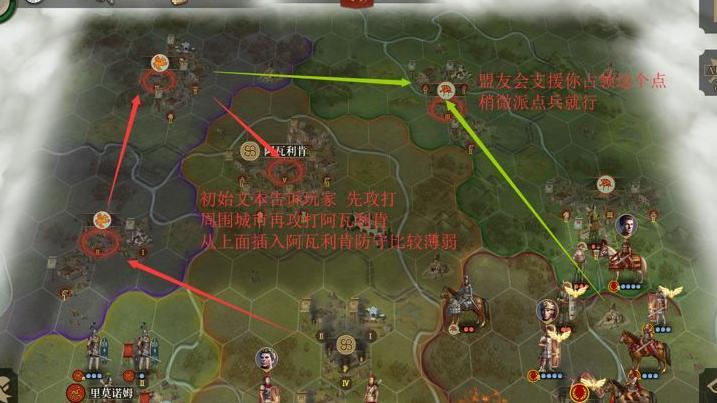 首先攻占阿瓦利肯左侧的关键据点,接着夺取左上方红圈城市,再从上方推进进攻阿瓦利肯更为顺利。右上方红圈城市只需派遣少量兵力牵制,主力可依靠友军支援协同作战。