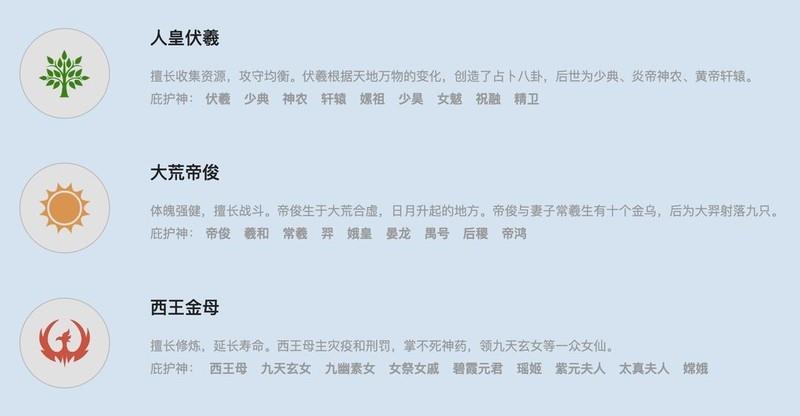 三大神系分别为人皇伏羲、大荒帝俊与西王金母,各自拥有独特的神力与专属天赋。