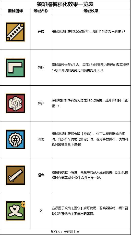 重新解析强化内容,鲁班的器械组装分为六大类别,实际对战中最多选用三种,需结合个人需求与名臣组合进行合理搭配,具体可参考下表选择。