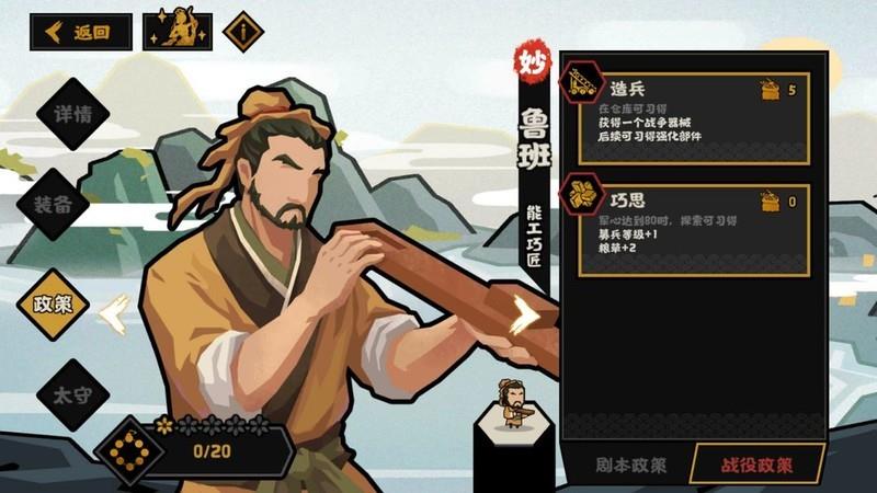 鲁班最具特色的机制在于实施后进入兵械制作界面,可对三种器械进行改造,同一强化词条在不同器械上会触发各异的效果,具体细节下文将详细说明。