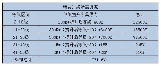 精灵最高50级,升级仅需原力,无需星券,满级可获得100%生命加成的精灵盾,效果与普通及光暗精灵相同。