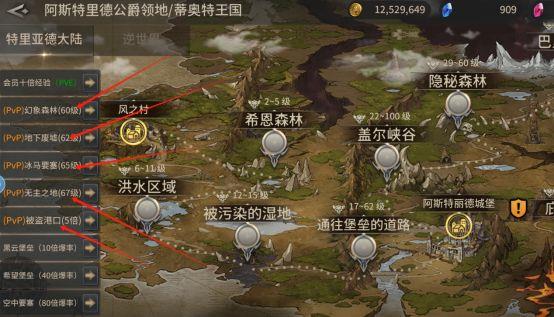 日常刷BOSS地图包括60、62、65、67层,盗贼港口有5倍经验,但最重要的还是恩马BOSS,具体位置见下方图解。