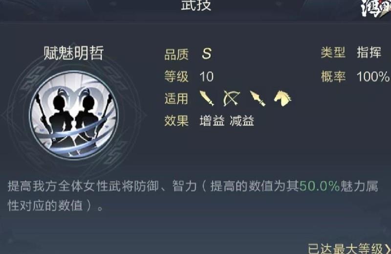 赋魅明哲是一项专为女性武将设计的技能,能有效弥补她们在防御与智力方面的不足,尤其提升法师类武将的输出能力。配合步练师所属的步兵兵种,可轻松组建兼具高输出、强生存与持续作战能力的均衡队伍,整体战斗力显著增强。