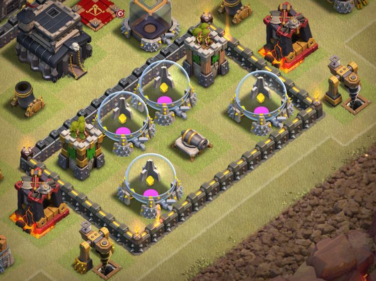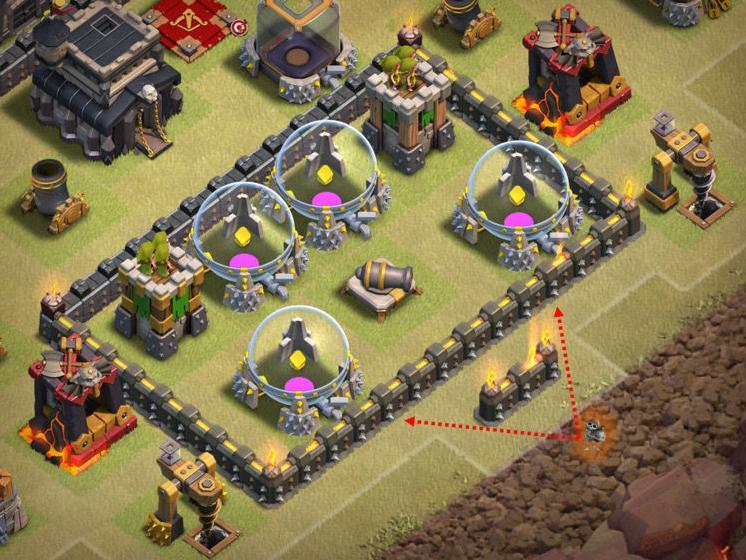 接下来进行实际操作讲解,以上图为例,大本营周围环绕着城墙,内部设有若干防御设施。有人可能会选择从加农炮位置破墙而入,引导部队进入并摧毁这些防御建筑。