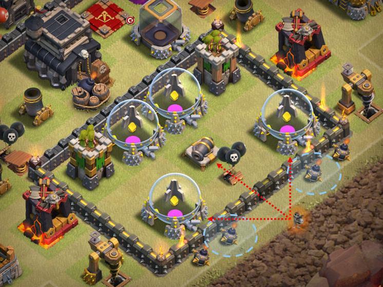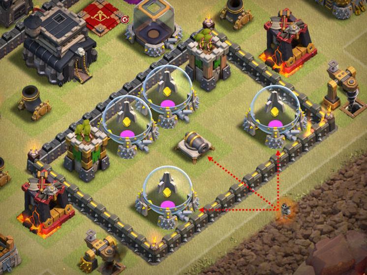 可在加农炮前方增设一段城墙,因城墙后方无建筑,炸弹人不会将其作为目标,会绕行至两侧圣水罐处破墙,或直接在圣水罐位置释放炸弹人进行攻击。