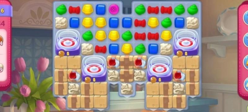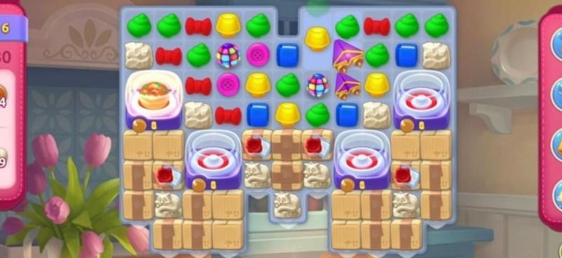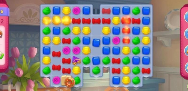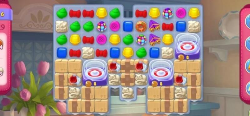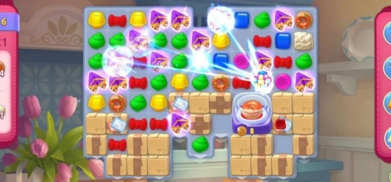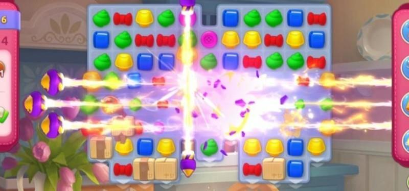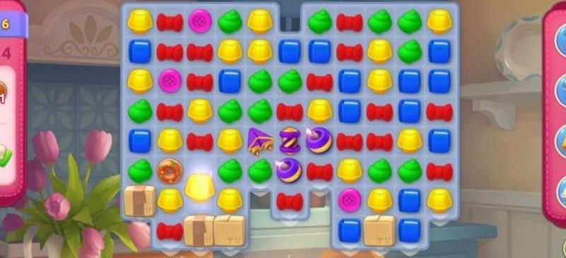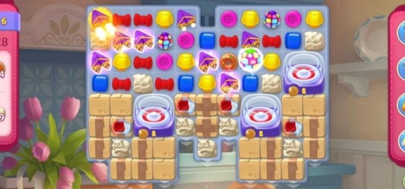 尽管赠送了彩虹球,但作用有限。首要任务是移动上方图块,通过匹配合成加速道具,从而更高效地清除障碍箱并加快甜甜圈的生成速度。